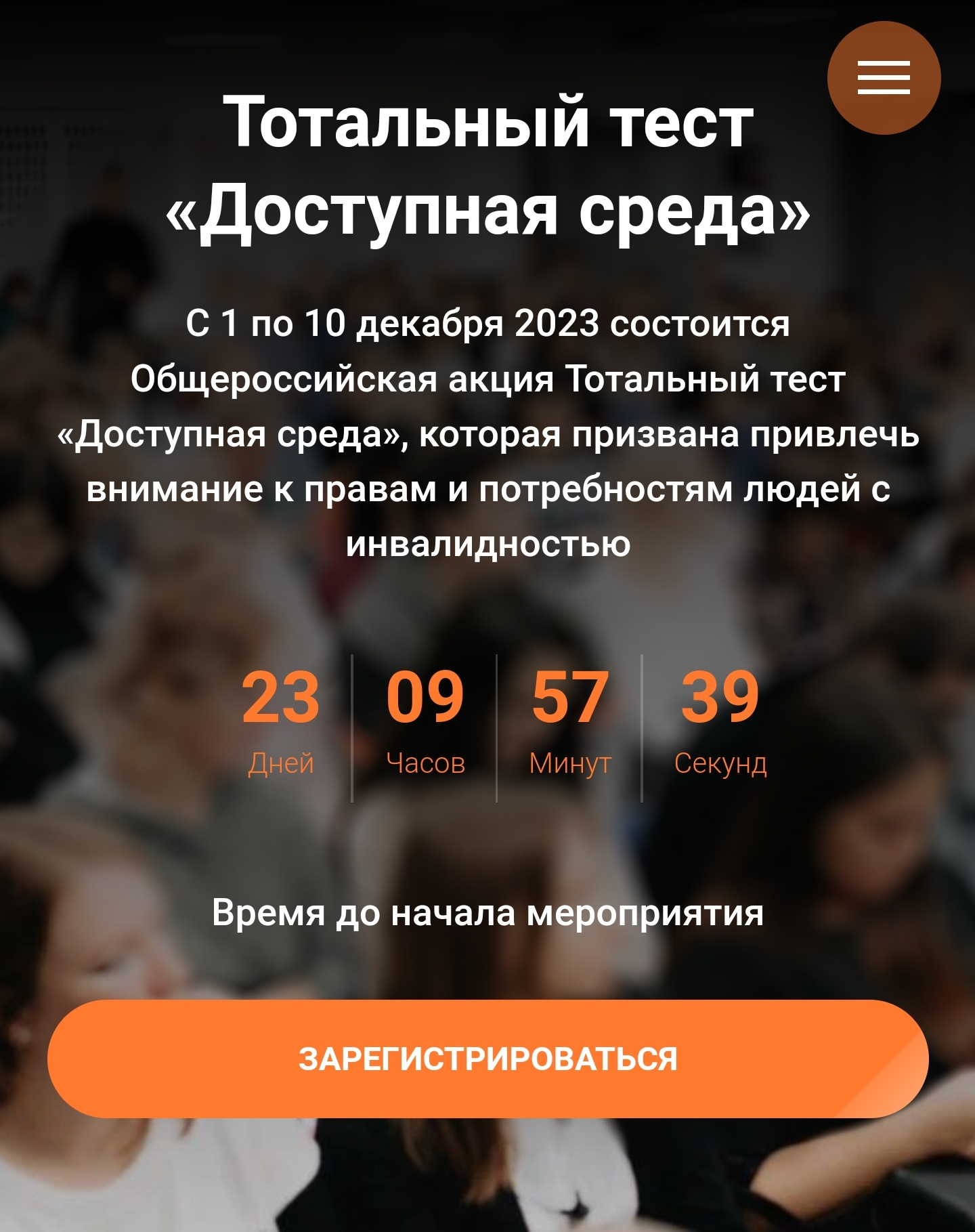 призванная привлечь внимание граждан России к правам и потребностям людей с инвалидностью. В течение Декады инвалидов во всех регионах России будет проходить проверка знаний по вопросам инклюзивного общения и организации доступной среды, а также будут организованы просветительские мероприятия и акции, направленные на улучшение качества жизни людей с инвалидностью. Для участия в мероприятии необходимо зарегистрироваться по адресу: www.total-test.ru. Спикерами Тотального теста «Доступная среда» выступят известные государственные деятели, лидеры общественного мнения, представители культуры и искусства (Татьяна Голикова, Мария Львова-Белова, Никита Козловский, Диана Гурцкая и др.). Организаторы акции – Народный фронт, Академия доступной среды и Ассоциация «АУРА-Тех». Открытие Акции начнется 1 декабря 2023 года в 10.00 ч. по московскому времени. Самостоятельное тестирование можно будет пройти со 1 по 10 декабря 2023 года в любое удобное время на сайте акции: www.total-test.ru. https://total-test.ru/?ysclid=loh8cfnfm4813329924