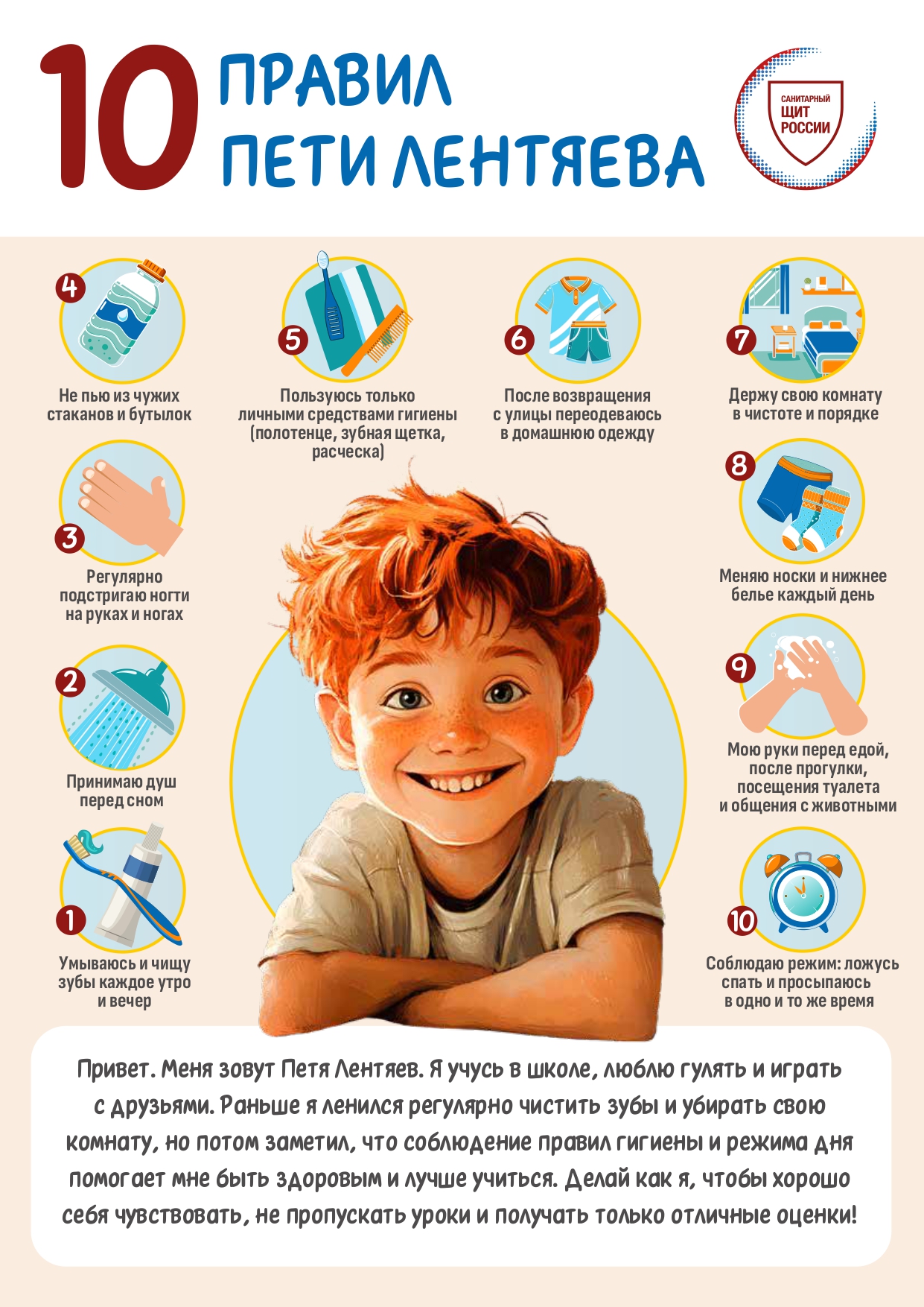 15.10.2024Привет. Меня зовут Петя Лентяев. Я учусь в школе, люблю гулять и игратьс друзьями. Раньше я ленился регулярно чистить зубы и убирать своюкомнату, но потом заметил, что соблюдение правил гигиены и режима дняпомогает мне быть здоровым и лучше учиться. Делай как я, чтобы хорошосебя чувствовать, не пропускать уроки и получать только отличные оценки!