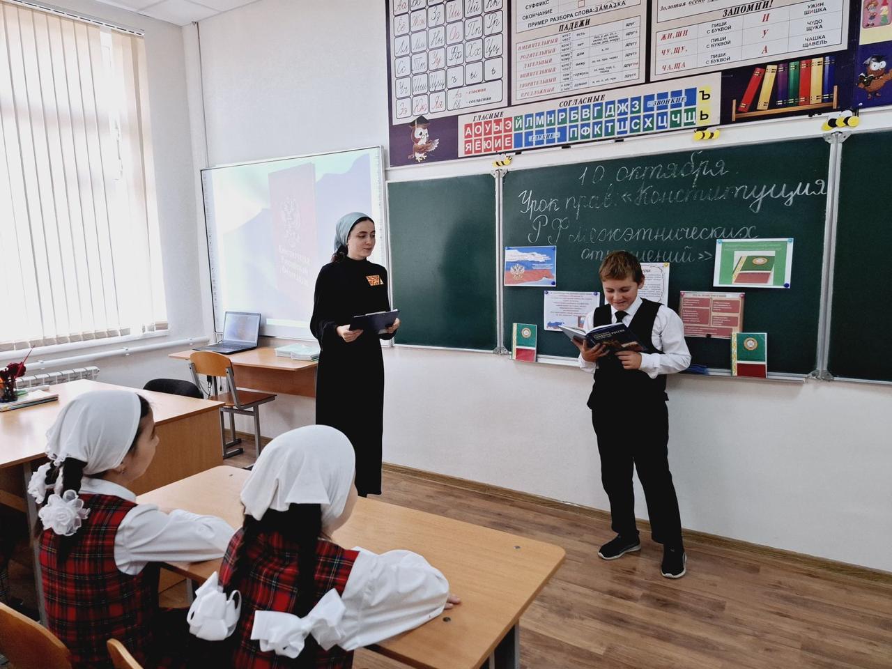 10.10.202410 октября 2024 г в МБОУ «Калиновская НОШ» с учащимися 4 класса учитель начальных классов Булатмурзаева Б.А., Булатмурзаева Р.А. и социальный педагог Хабусиева Л.М., провели с урок права под названием «Конституция РФ о межэтнических отношениях», целью которого стала профилактика экстремистской деятельности в молодежной среде и развитие толерантной ответственной личности, ориентированной на ценности гражданственности и патриотизма. В ходе урока ребята просмотрели презентацию «Конституция РФ о межэтнических отношениях». Попытались разобраться в очень сложной и серьезной проблеме, весьма актуальной в нашей стране, проблеме межнациональных отношений. Мы имеем разные национальности и исповедуем разную религию, но при всем этом, живем в одном многонациональном государстве, и отношения между его жителями зависят от каждого из нас.