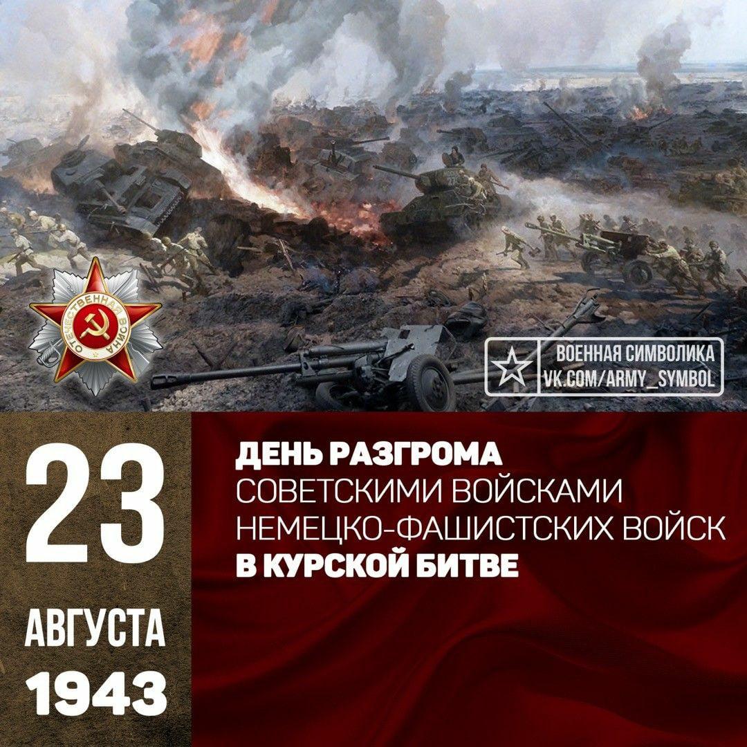 23.08.2025В мировой истории есть события, оставляющие неизгладимый след в памяти человечества. Одним из таких событий является победа Советской Армии в исторической битве на Курской дуге летом 1943 года, которая во многом определила дальнейший ход всей Второй мировой войны и победу Советского Союза над гитлеровской Германией.День разгрома советскими войсками немецко-фашистских войск в Курской битве (1943 год) является Днем воинской славы России в соответствии с Федеральным законом от 13.03.1995 № 32-ФЗ «О днях воинской славы и памятных датах России» и отмечается 23 августа.Советская Армия, которая в предшествовавшие два года тяжёлой и длительной борьбы с немецко-фашистскими полчищами не только отразила натиск вероломного агрессора, вторгнувшегося в пределы СССР, но и в грандиозных сражениях под Москвой и Сталинградом нанесла врагу сокрушающее поражения, вновь оказалась непреодолимым барьером на пути врага. Натолкнувшись на героическое сопротивление советских войск на Курской дуге, гитлеровская армия была вынуждена отказаться от наступления на востоке и признать своё новое поражение.В сражениях Курской битвы был сломан становой хребет гитлеровского вермахта. Коренной поворот в ходе Второй мировой войны, начавшийся ещё в битве под Москвой и получивший наибольшее развитие в Сталинградской битве, в сражениях на Курской дуге был окончательно завершён.В ходе битвы на Курской дуге состоялось крупнейшее танковое сражение Второй мировой войны. Оно произошло 12 июля 1943 года под деревней Прохоровкой. Битва была кровопролитной, с обеих сторон в ней принимало участие более 1200 танков и самоходных орудий. Именно это сражение во многом и предрешило исход всех военных действий под Курском и Орлом летом 1943 года, что и привело к стратегическому перелому во Второй мировой войне и прочному переходу стратегической инициативы в руки советского командования.Белгород, Курск и Орёл стали первыми городами России, которым присвоено почётное звание «Город воинской славы», а Белгород и Орёл стали городами «Первого салюта»