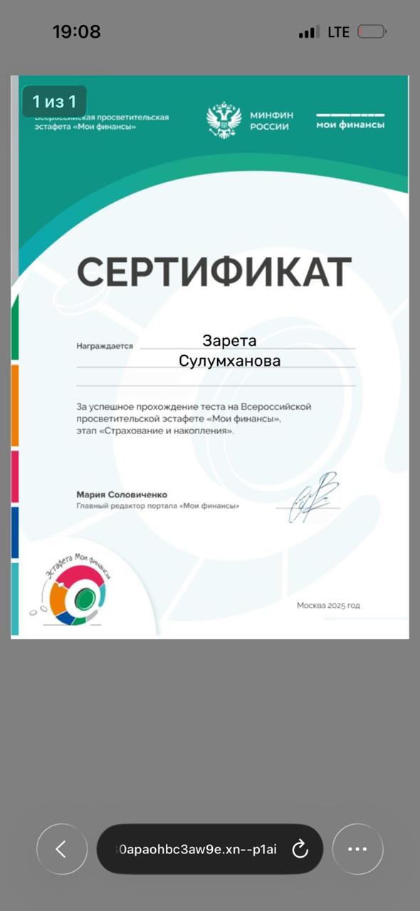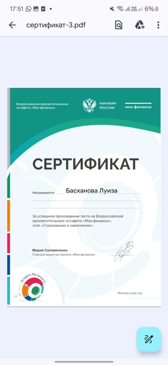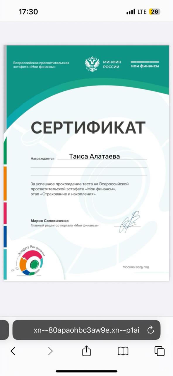 В МБОУ « Калиновская НОШ» 10 ноября 2025 г прошла тематическая «Всероссийская просветительская эстафета «Мои финансы». Которая посвящена теме: «Семейный бюджет: как не ссорится из-за денег?».Провели тест к шестому этапу: Думай о будущем: страхование и накопленияПолучили сертификат.