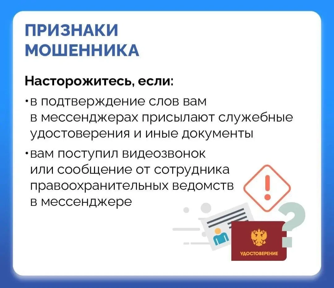16.04.2026ФСБ России обращает ваше внимание на участившиеся случаи телефонного мошенничества. Злоумышленники звонят детям и взрослым, представляясь сотрудниками правоохранительных органов (ФСБ, МВД, Следственного комитета). Что делают мошенники: — Сообщают, что «ваш родственник попал в беду» — Говорят об «оформлении кредита мошенниками на ваше имя» — Требуют перевести деньги на «безопасный счет» — Просят назвать код из СМС или данные банковской карты — Убеждают никому не рассказывать о разговоре Важно знать: - Сотрудники ФСБ и полиции никогда не звонят гражданам с подобными требованиями - Не существует никаких «безопасных счетов» - Коды из СМС, пароли и данные карт нельзя сообщать никому
